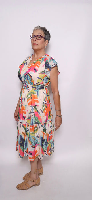 Layered Ruffle Sleeve Split Neck Dress with Ruffle Hem Neckline