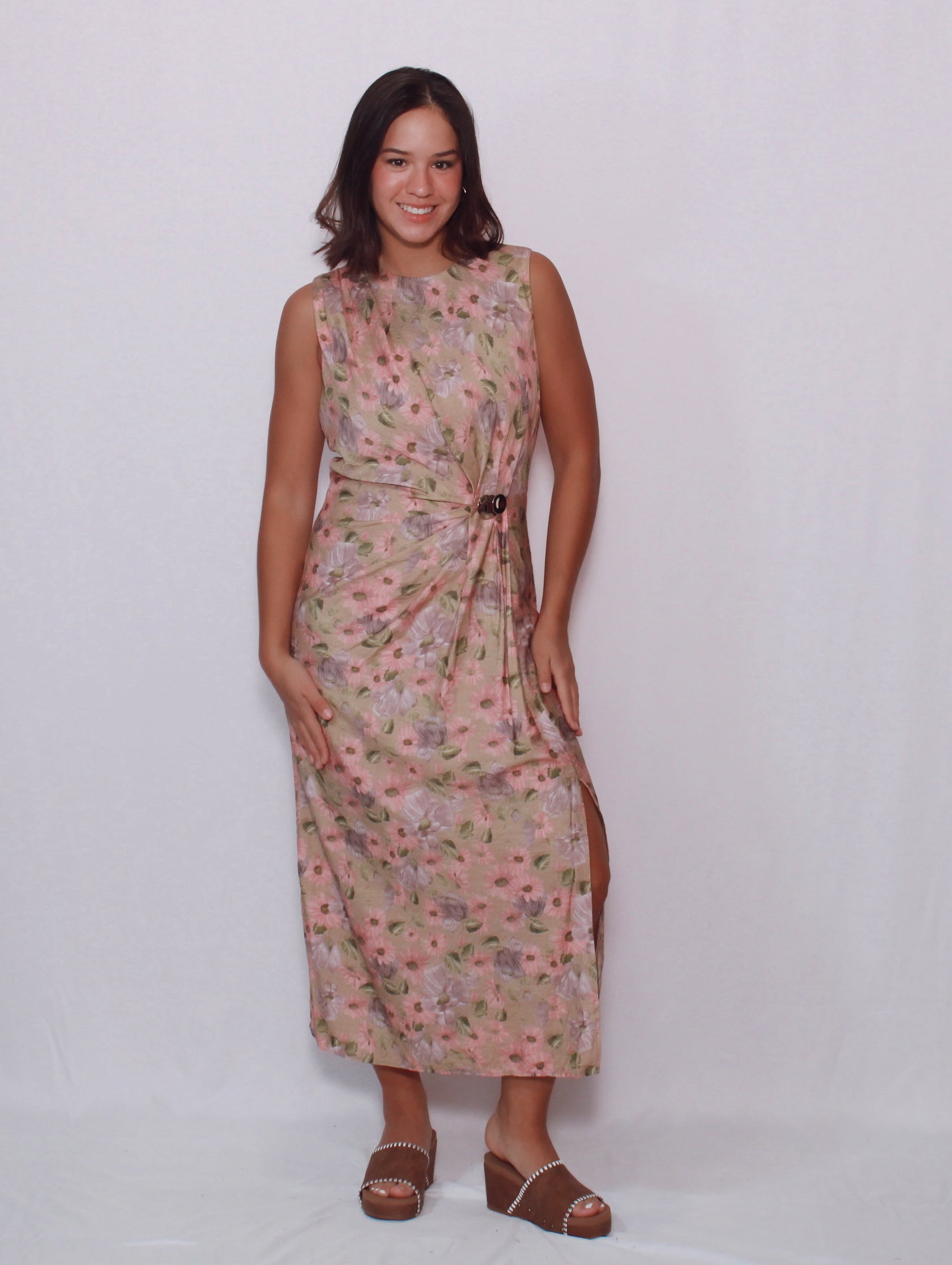 Step into timeless charm with this vintage-inspired midi dress, adorned in a delicate floral print. Designed with a sleeveless silhouette and soft pleats, it features a flattering slit hem and elegant gold trim for a touch of glam. Crafted from a lightweight woven fabric, it’s fully lined for comfort and finished with a sleek back zipper. Airy, feminine, and perfect for garden parties or brunch dates.