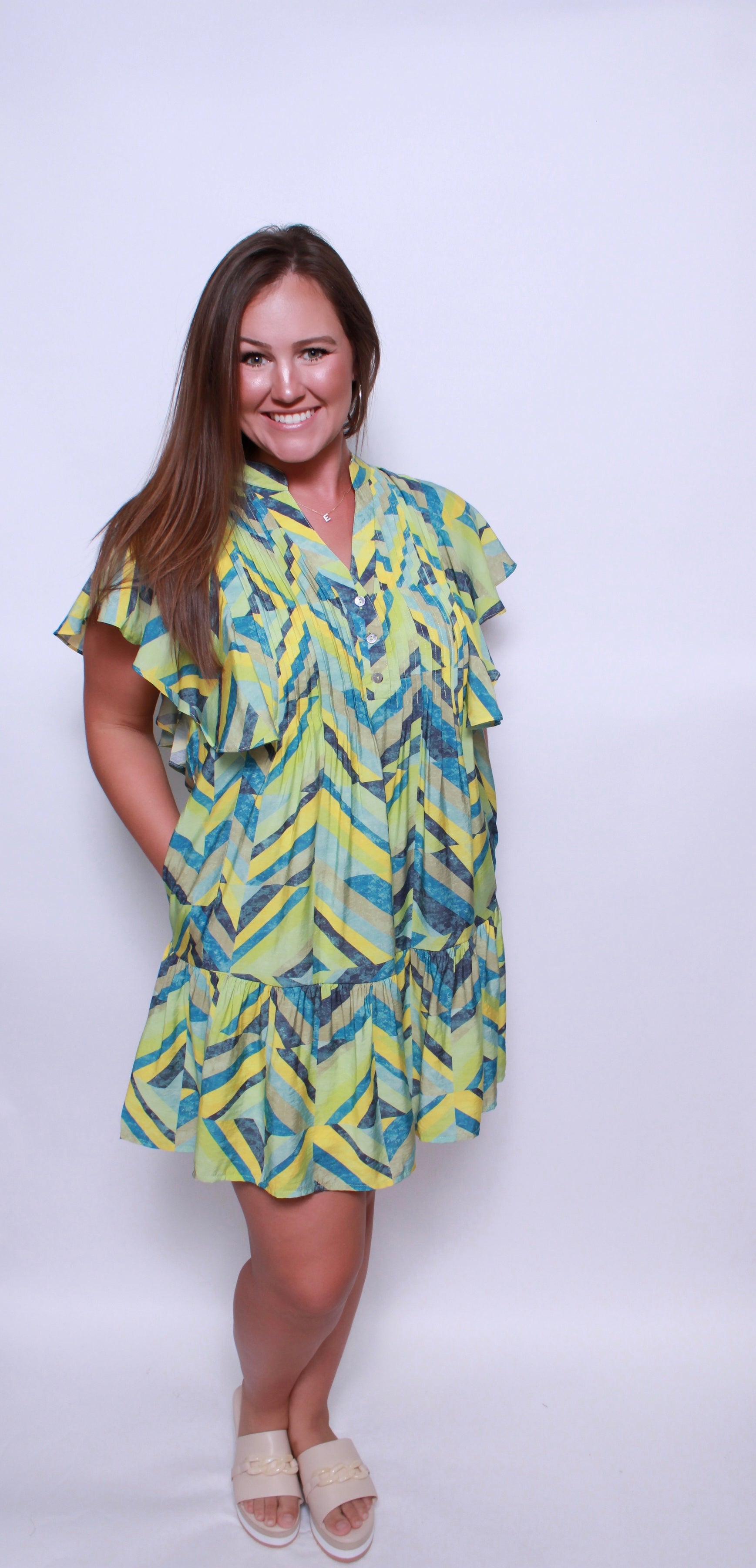 Printed flutter sleeve mini dress featuring pocket at sides.