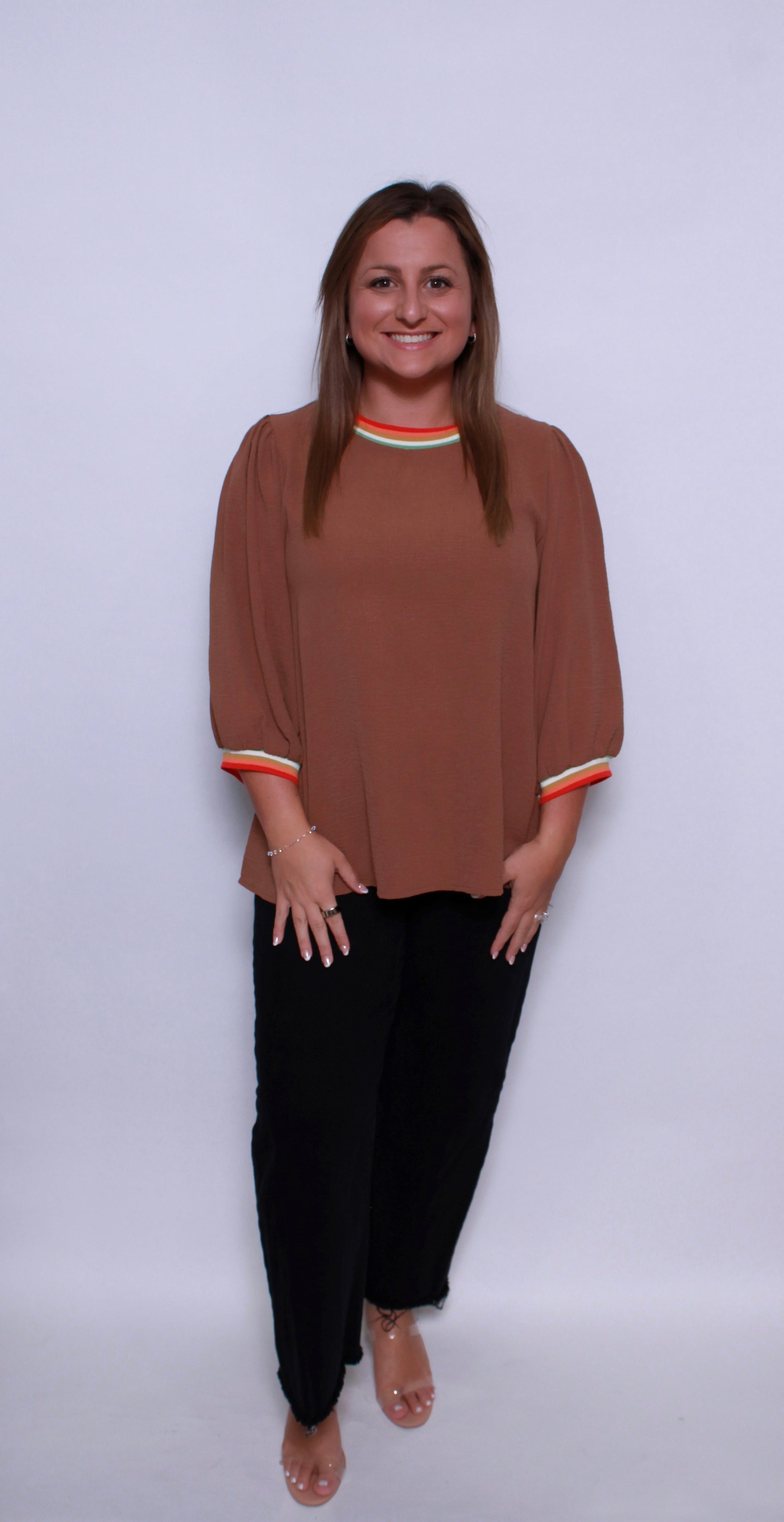 Solid top with U-neck, three quarter peasant sleeves, and striped ribbing at the sleeve ends and neck.