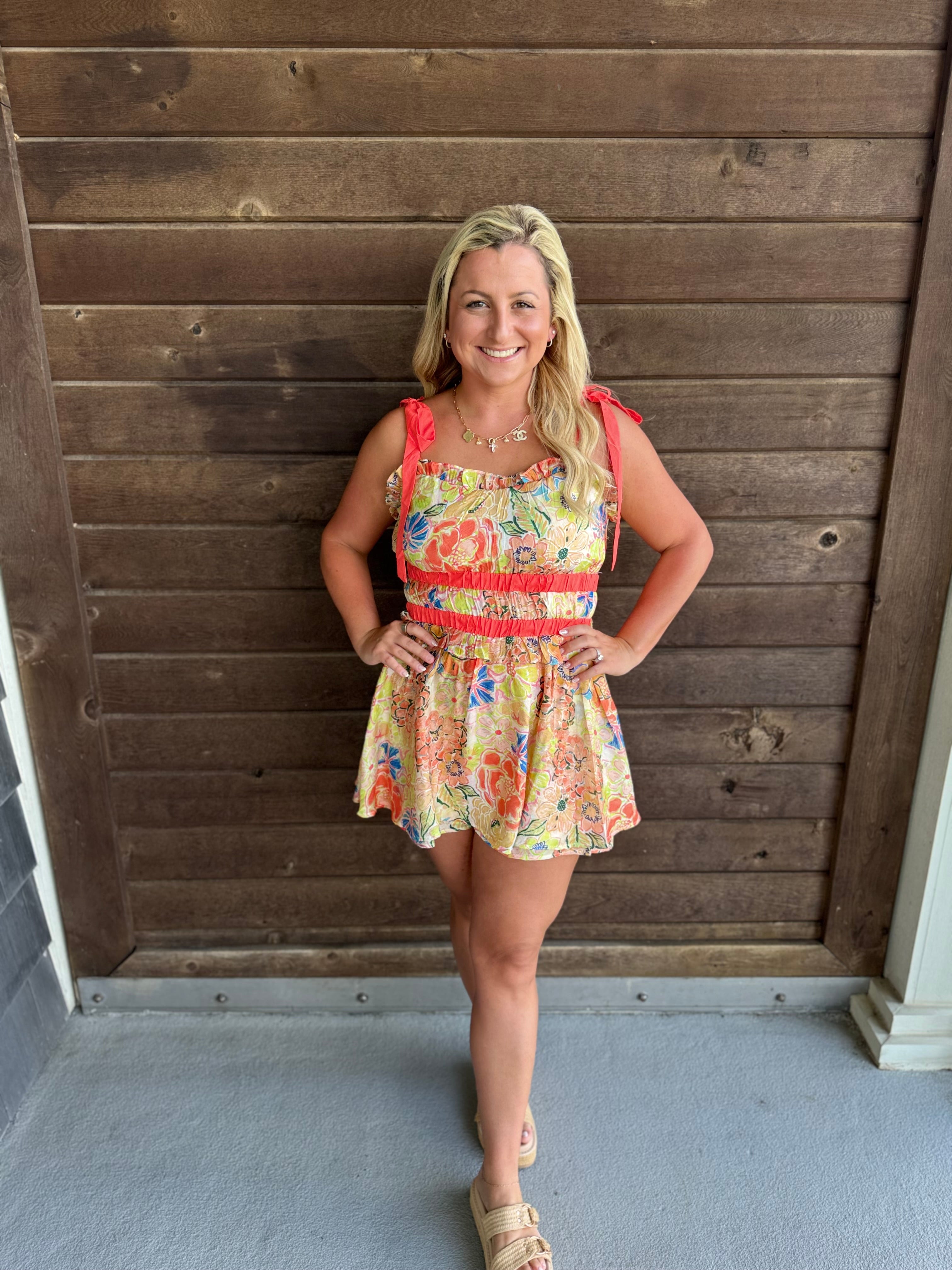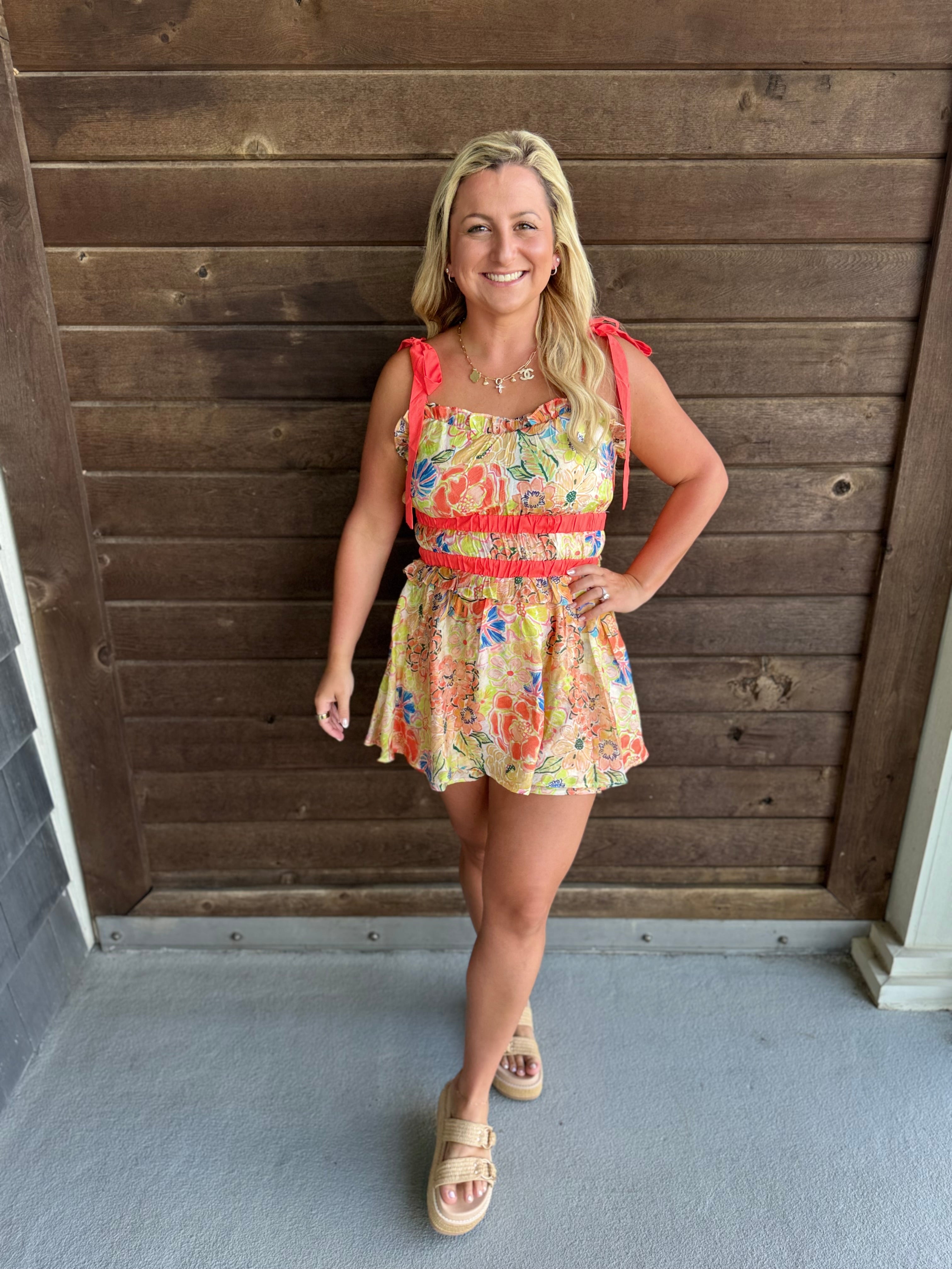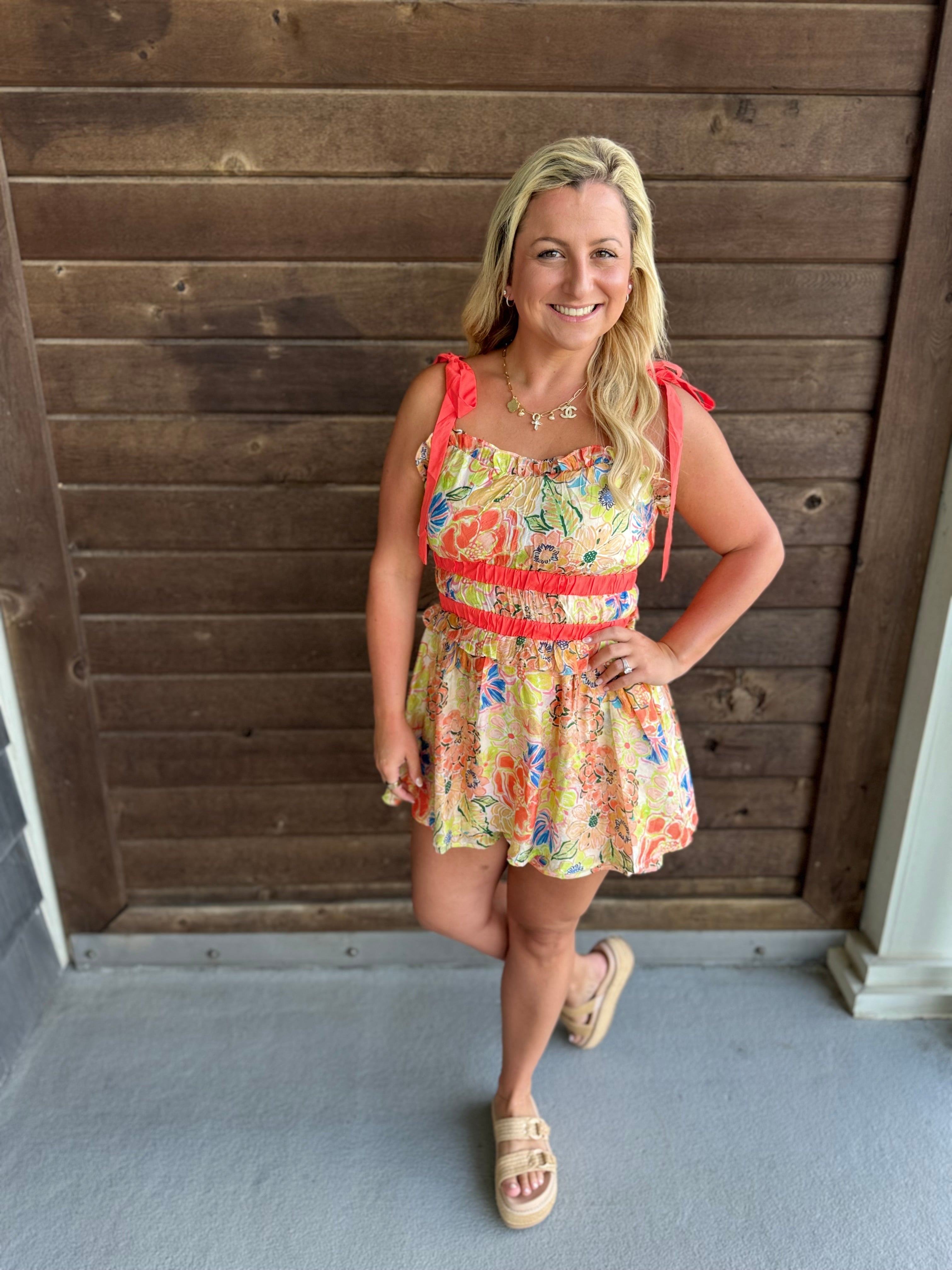 Radiate an effortless sense of charm in this floral skort romper with contrast binding! Woven floral fabric shapes this playful romper that falls from adjustable tying straps into a ruffled neckline. Fitted bodice with tiered elastic contrast binding leads to a skort overlay with shorts underneath. Pair this trendy romper with sneakers and get ready to dance the night away!
