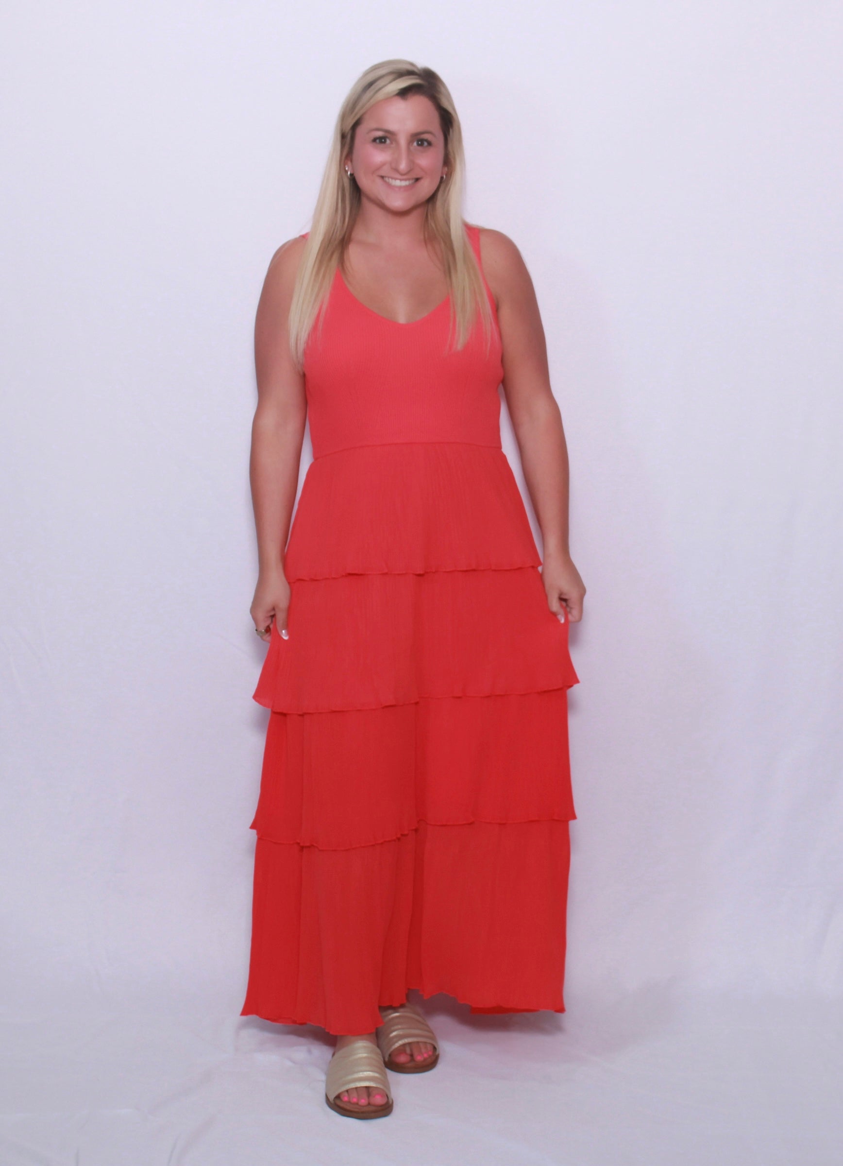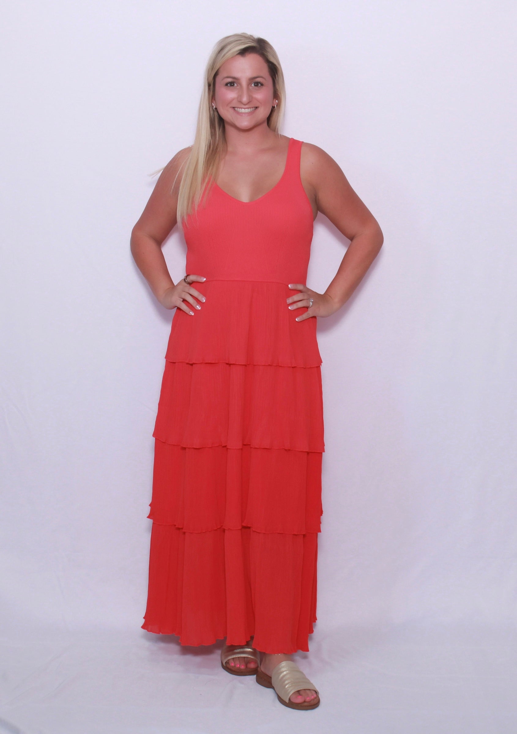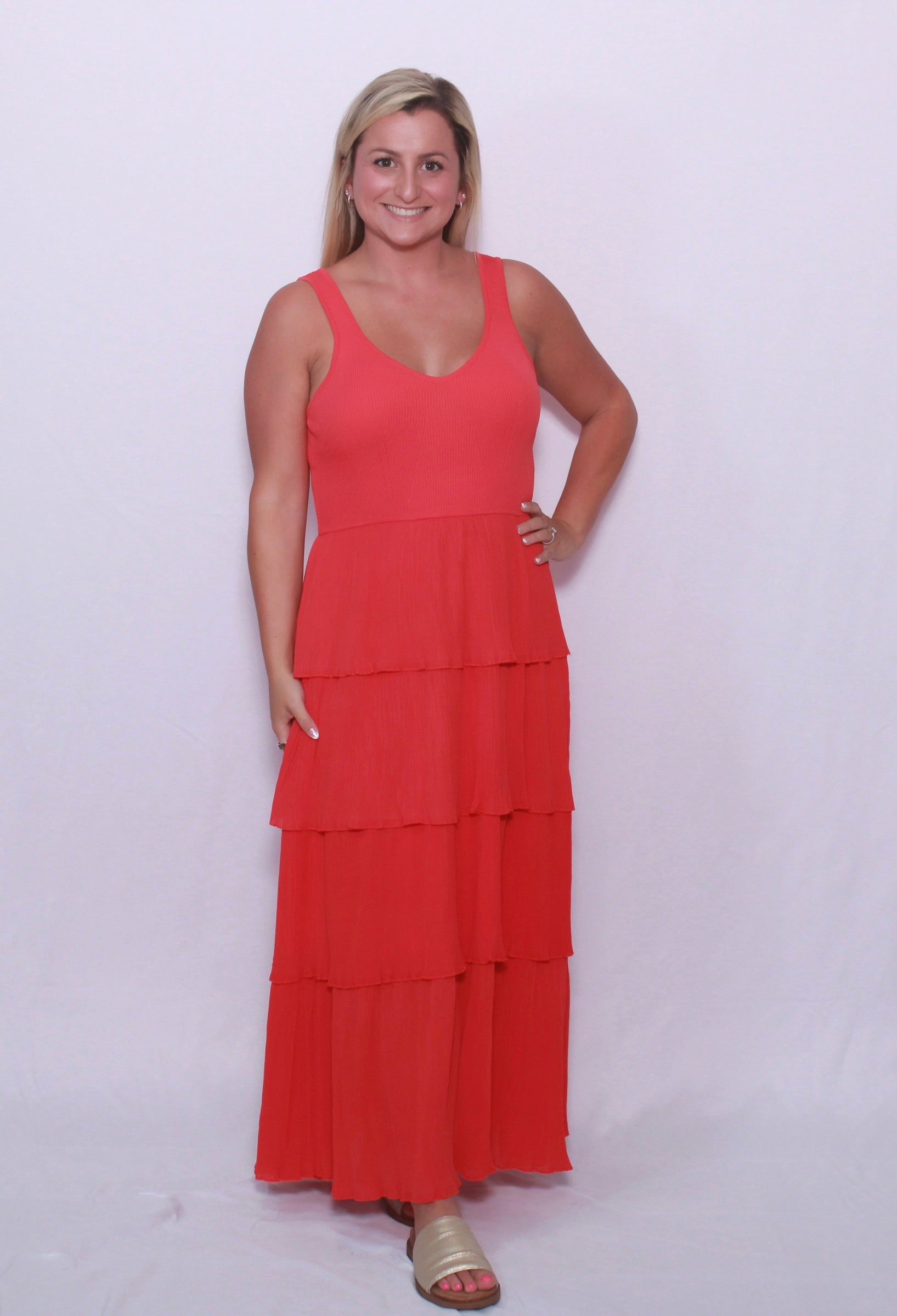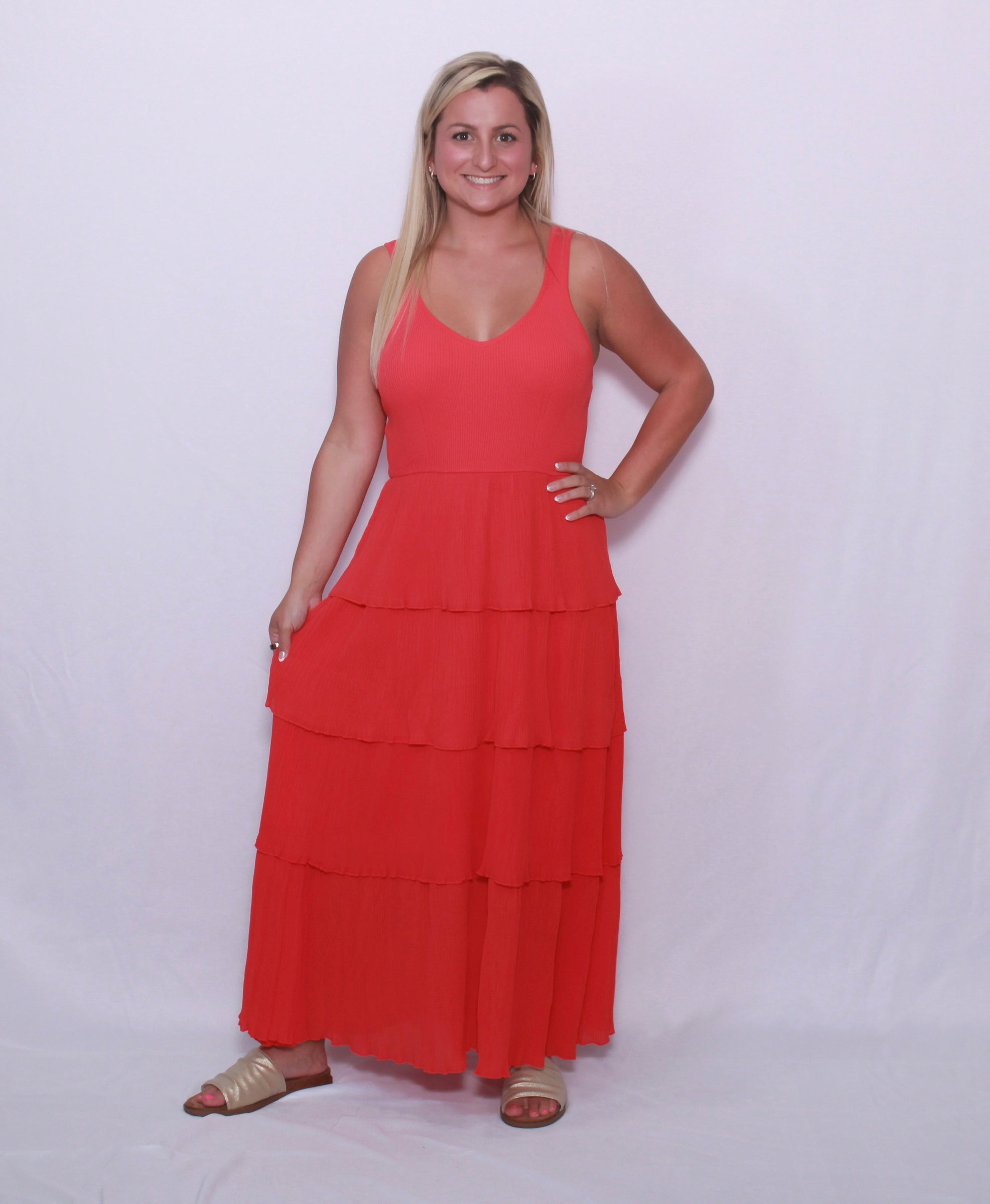 Bring sophistication and romance with you wherever you go in our pleated tiered layer midi dress! The top is crafted from mixed media and shapes a flattering V-neck and sleeveless bodice, while the set-in waistline accentuates your figure. The four tiered layers of pleated plisse fabric create a stunning silhouette. Lined for comfort.