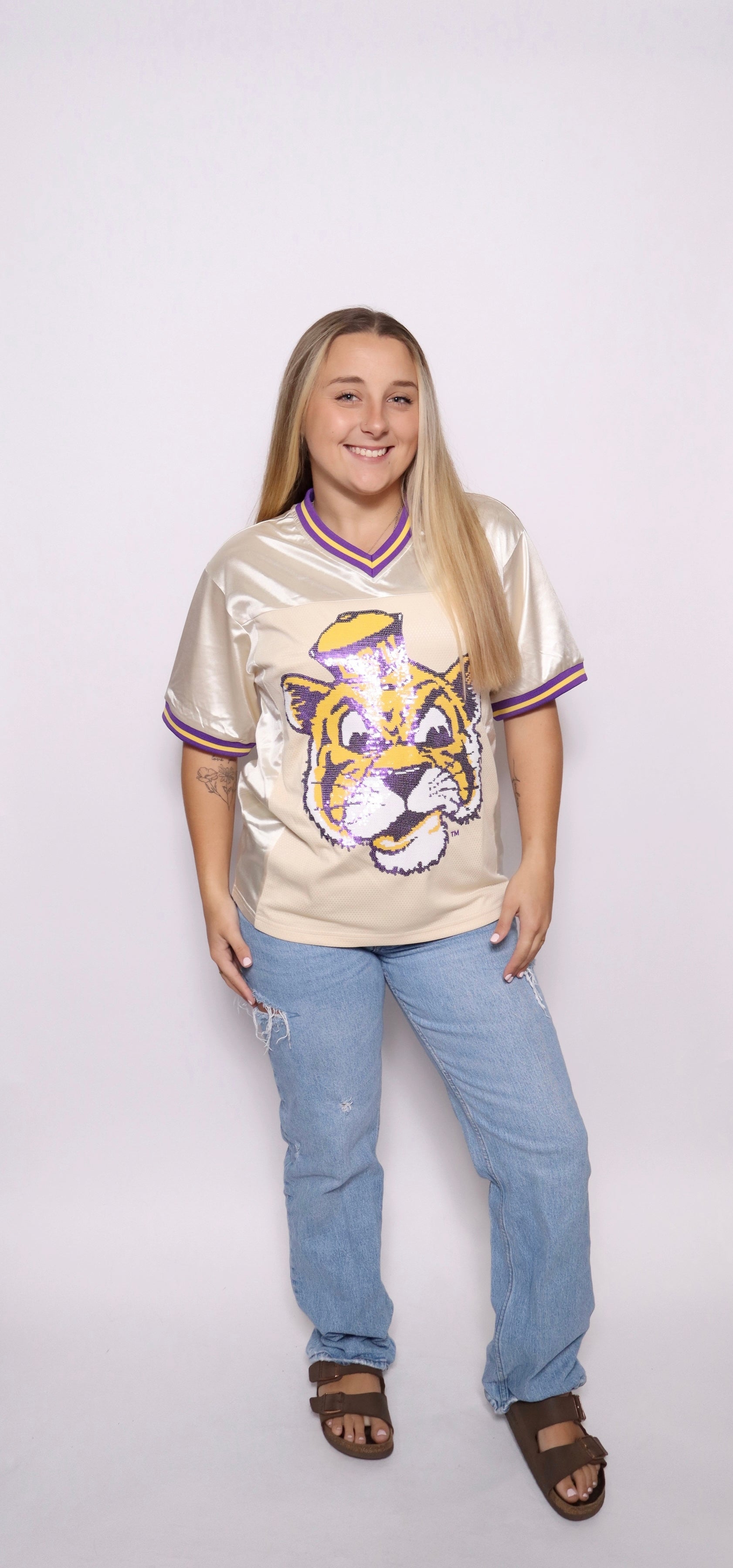 Women's Sequin Design Football Jersey (Champagne) OFFICIALLY LICENSED BY LOUISIANA STATE UNIVERSITY. Get ready for nights in Death Valley in our Football Jersey! The front features the iconic LSU Vintage Tiger in sequin embroidery, and LSU on the back! Material: Polyester Features: Sequin Embroidery on front & back. Size Chart available for size reference in the images. #GEAUXTIGERS