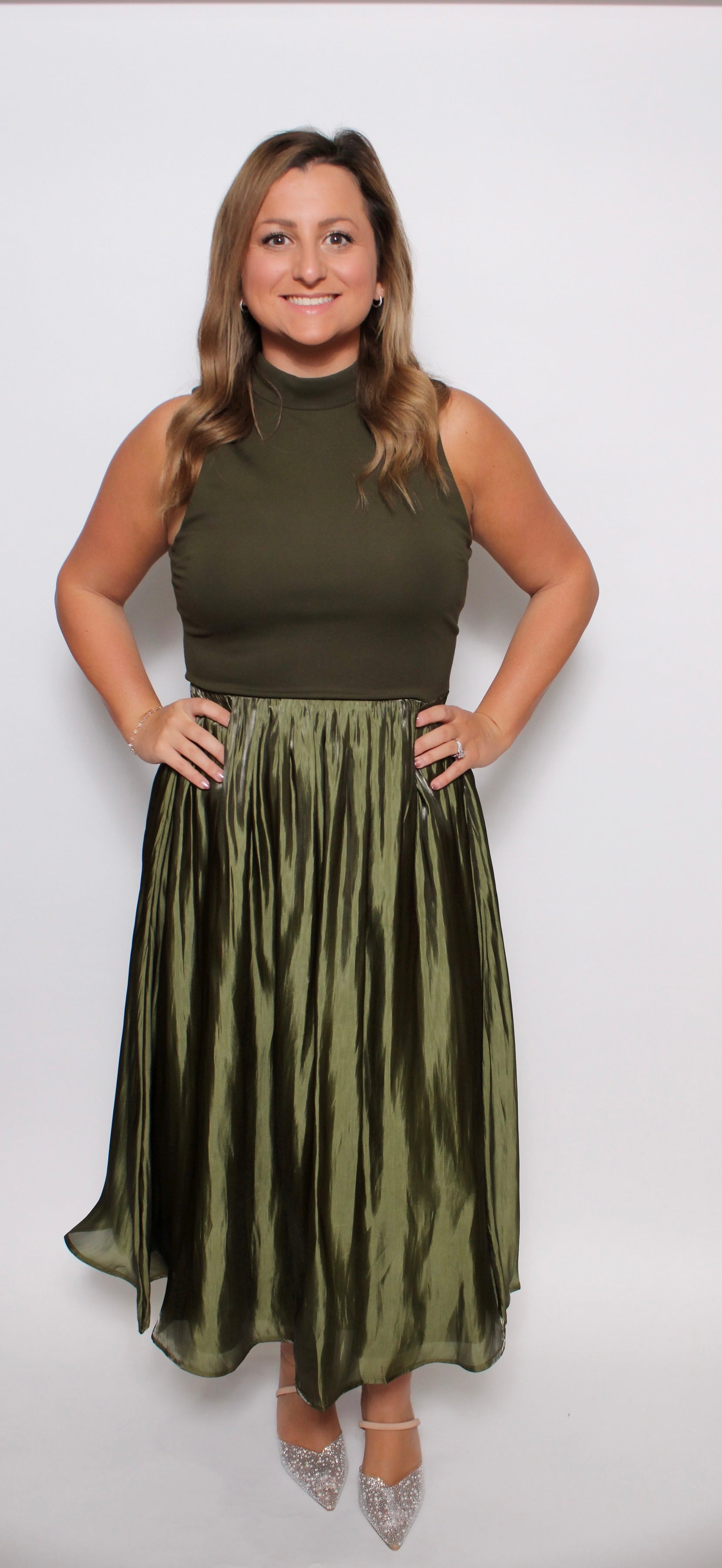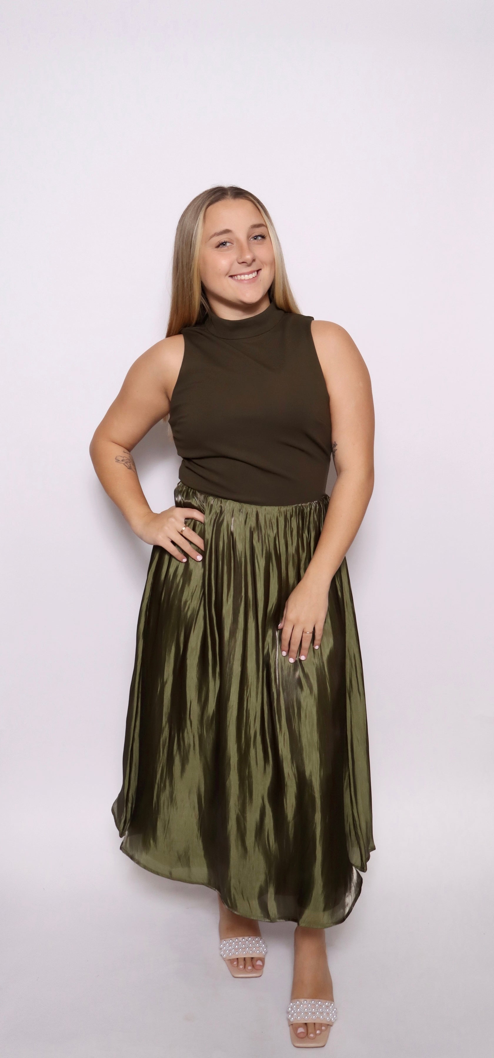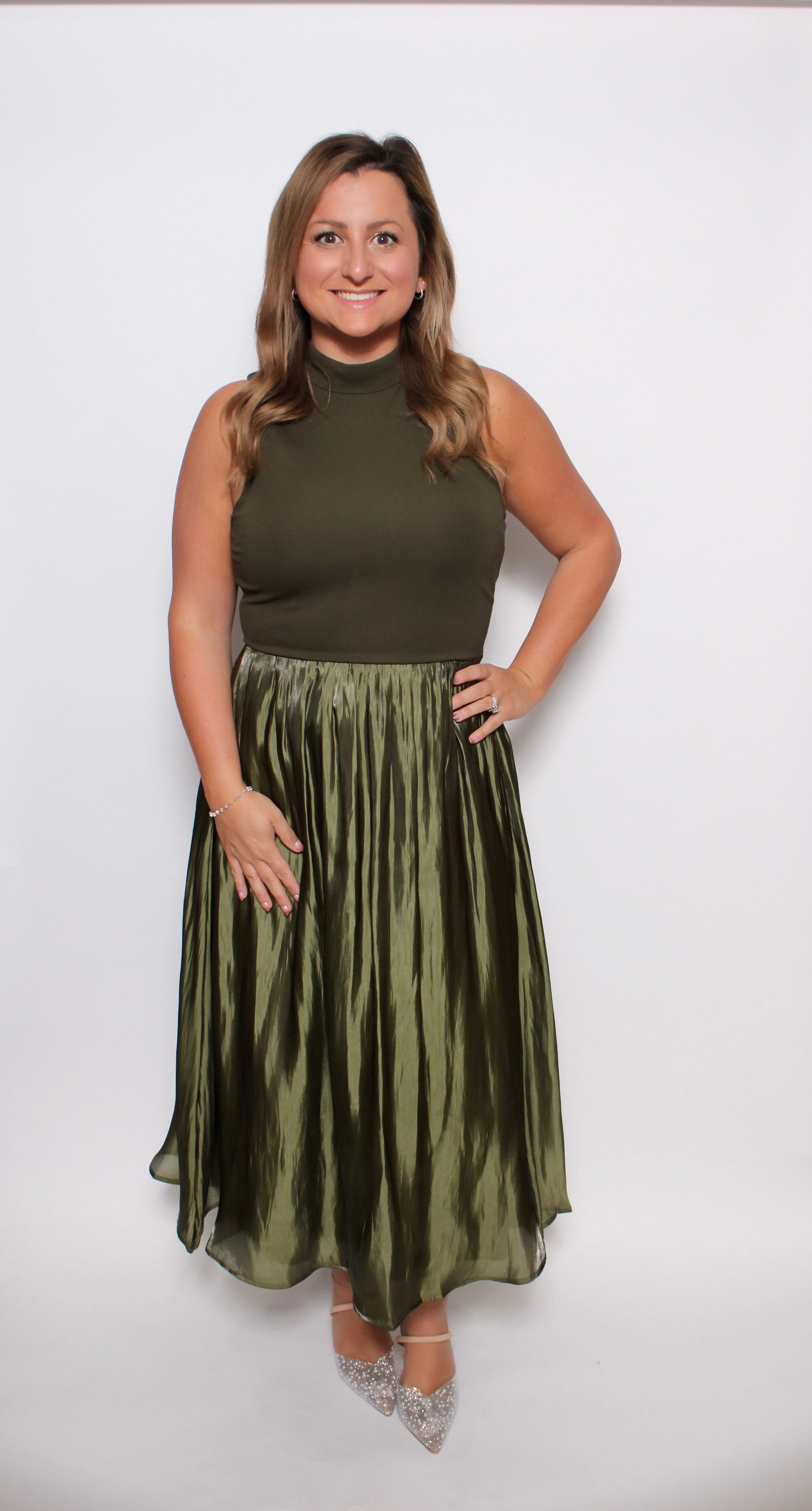 Effortlessly chic and versatile, the Olive Aura Maxi Dress combines a sleek mock-neck sleeveless bodice with a flowing, textured satin skirt. The rich olive tones create a sophisticated yet earthy vibe, making it perfect for brunch dates, special events, or an elevated everyday look. Pair it with statement earrings and strappy heels for a polished finish.