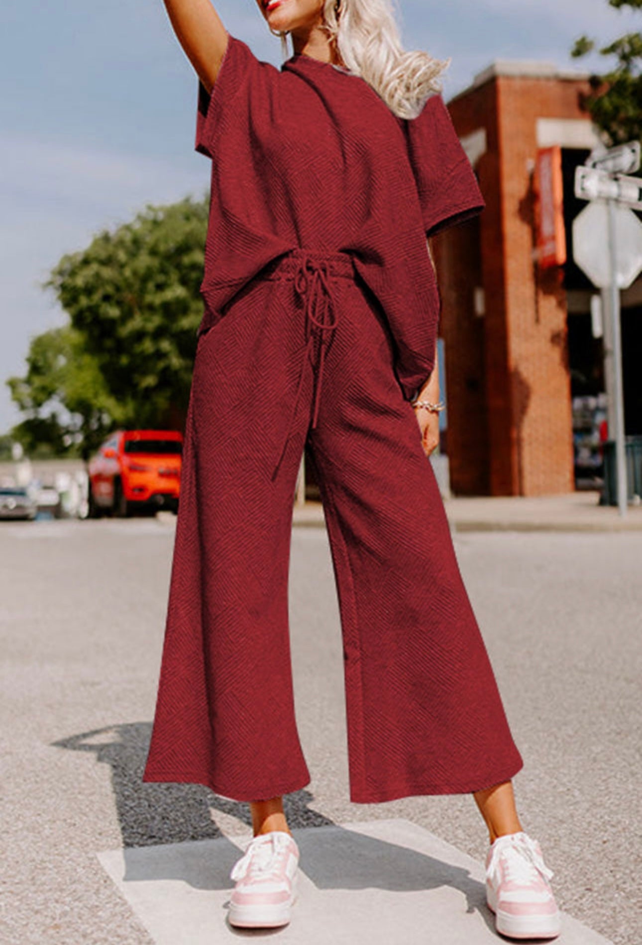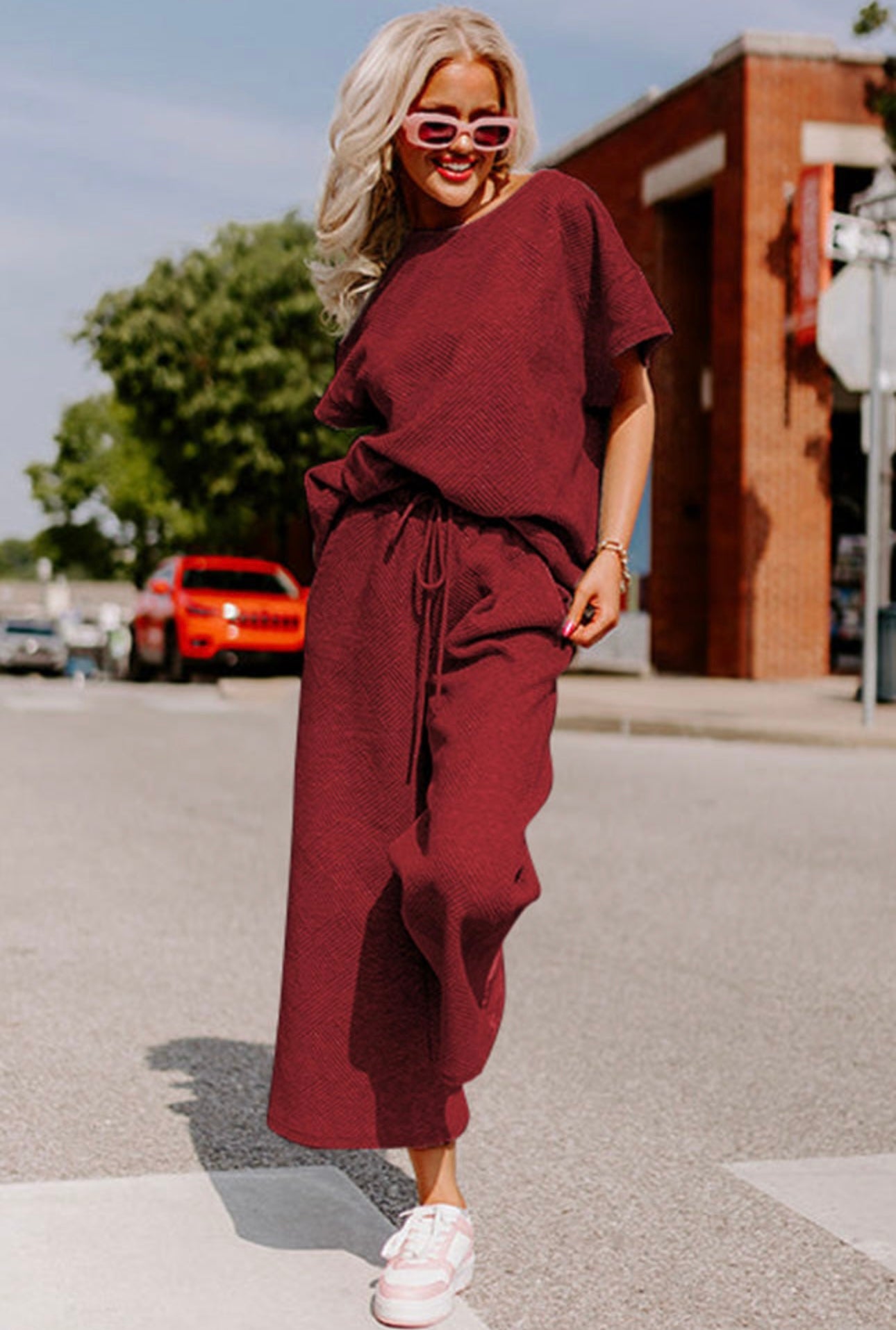 Elevate your casual chic with our Bordeaux Bliss Textured Set — the perfect blend of comfort and confidence. This two-piece ensemble features a relaxed, textured knit top with a flattering drop-shoulder fit and matching wide-leg pants with a drawstring waist for that effortless, tailored look. Whether you’re brunching, running errands, or hitting a weekend market, this set gives major off-duty model vibes while keeping you comfy all day long.