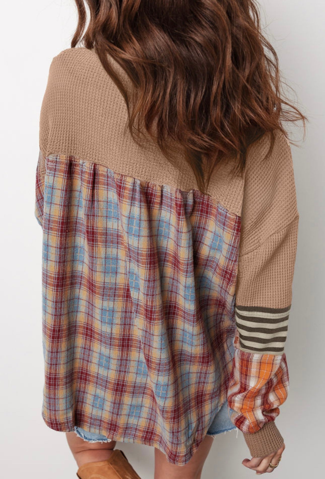 Bring all the cozy fall vibes in our Harvest Patchwork Waffle Top! Featuring a soft waffle knit body, striped accents, and plaid patchwork sleeves, this top gives that effortless boho-meets-rustic look we love. The relaxed fit and lightweight feel make it perfect for pairing with denim, boots, or leggings for all your autumn adventures — from pumpkin patches to bonfires!