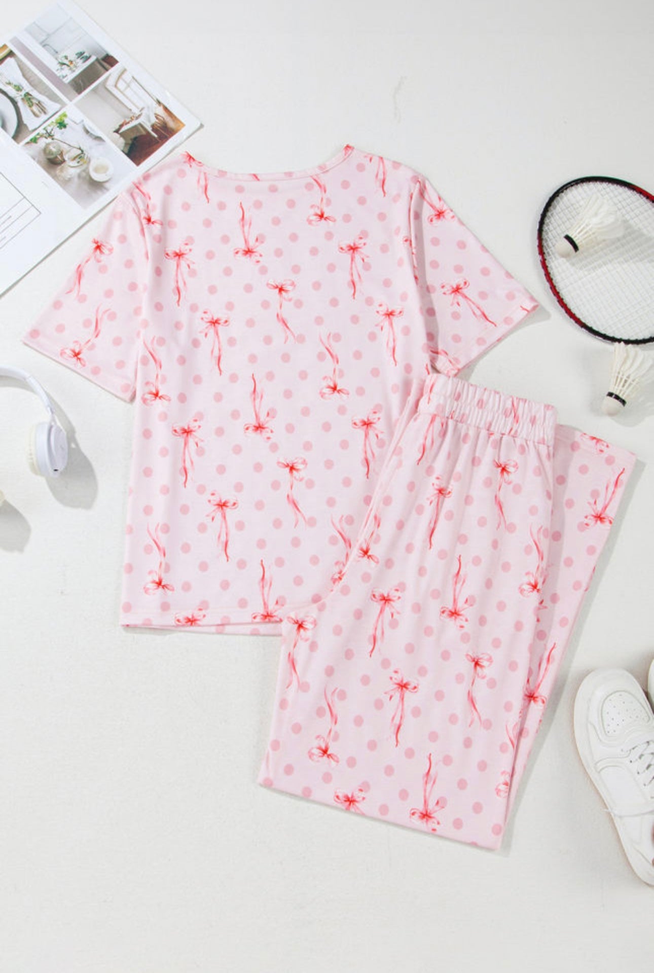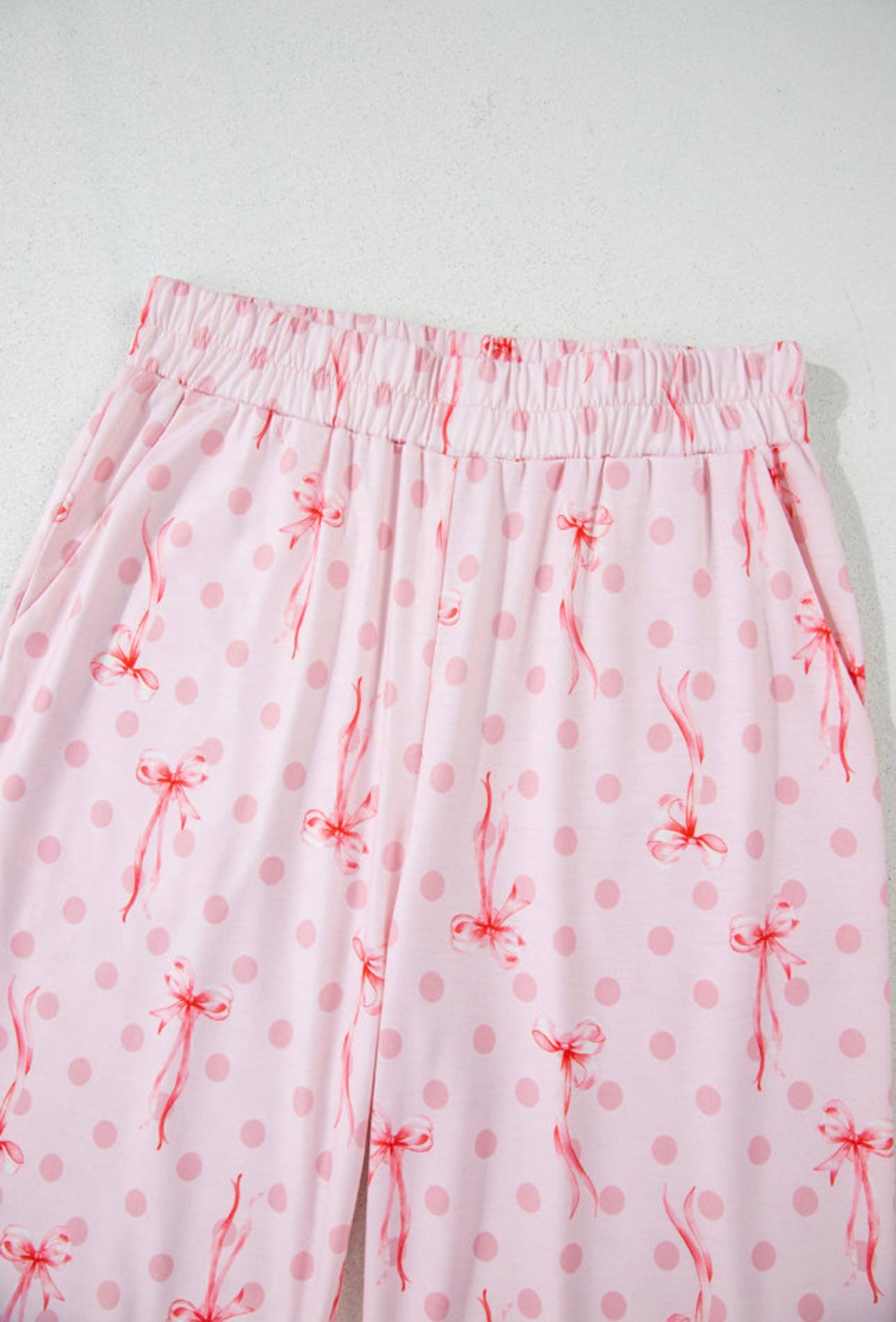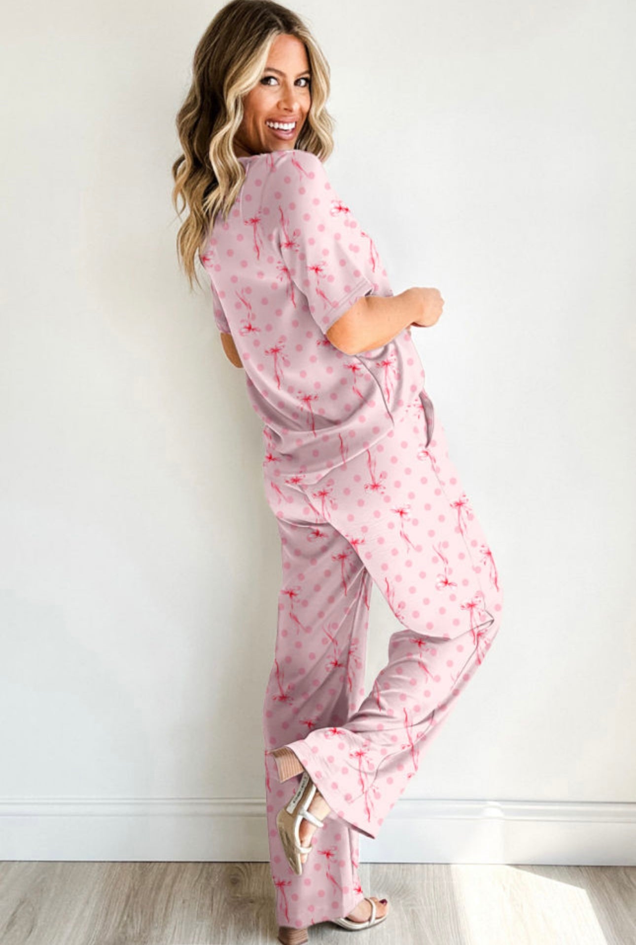 Stay comfy and cute in our Pretty in Pink Lounge Set! This dreamy two-piece features a blush-pink base with delicate bow and polka-dot details that add the perfect touch of girly charm. The relaxed-fit top and flowy wide-leg pants make it ideal for cozy days at home, brunch with friends, or travel days when you still want to look put-together.