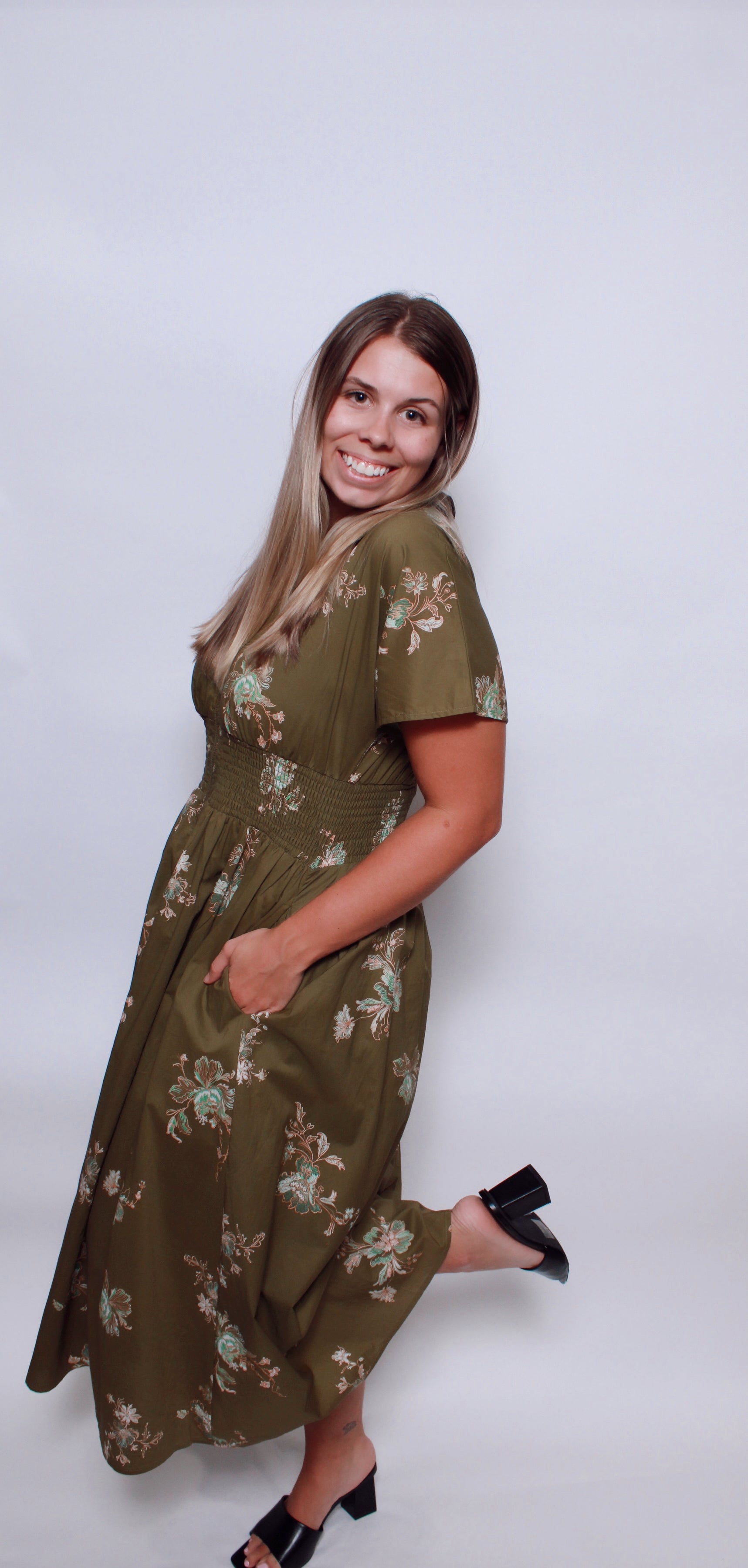 Step into effortless charm with the Olive Bloom Button-Front Midi Dress, a perfect blend of comfort and sophistication. Crafted from lightweight fabric in a rich olive green hue, this dress features a delicate floral print in soft cream and sage tones. The collared neckline and short sleeves bring a tailored touch, while the smocked waist flatters your figure with ease. Falling gracefully to mid-calf, it’s ideal for casual outings, garden parties, or a relaxed day at the office. Pair it with sandals for a breezy daytime look or dress it up with heels and a clutch for an evening affair.