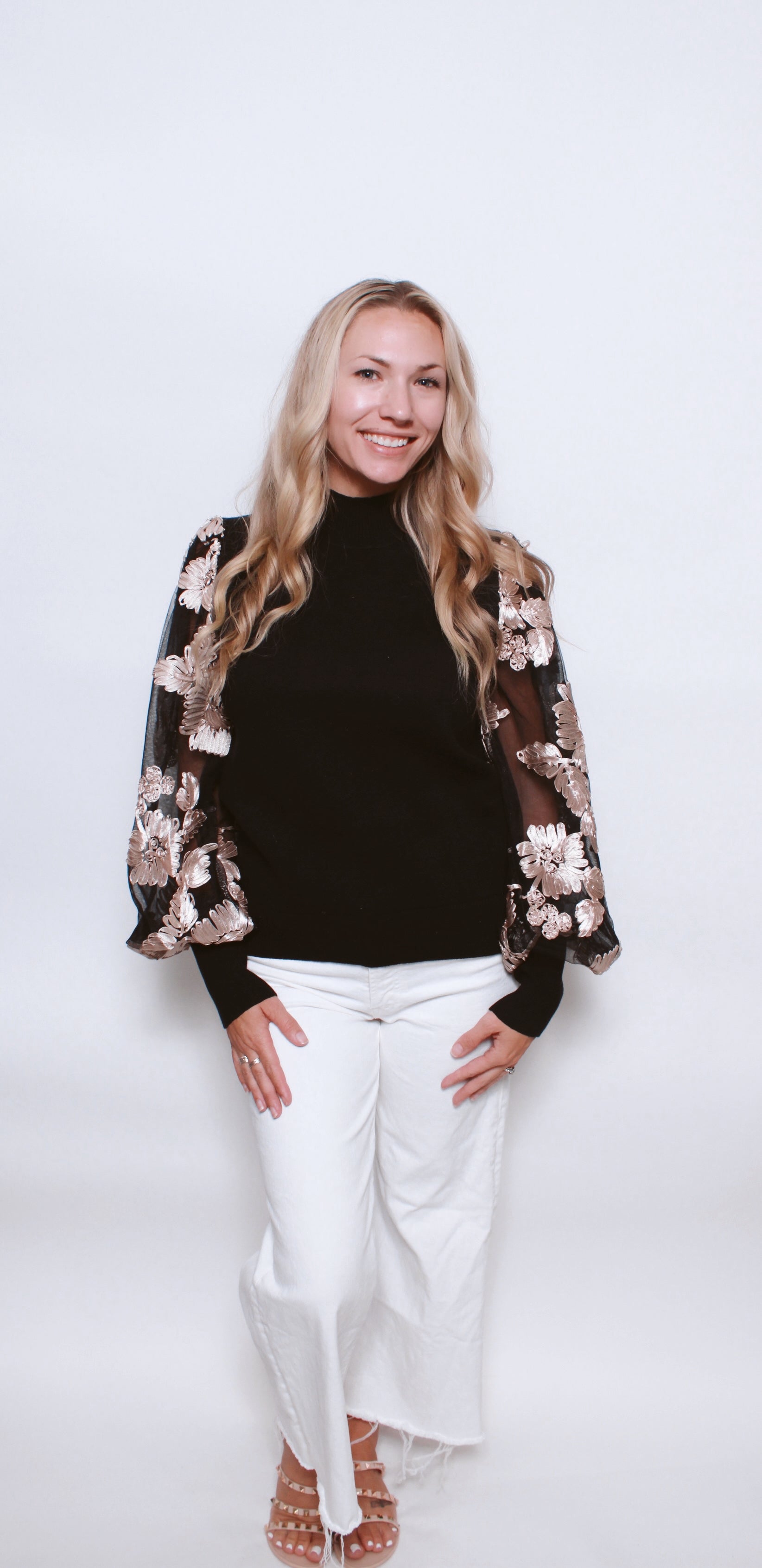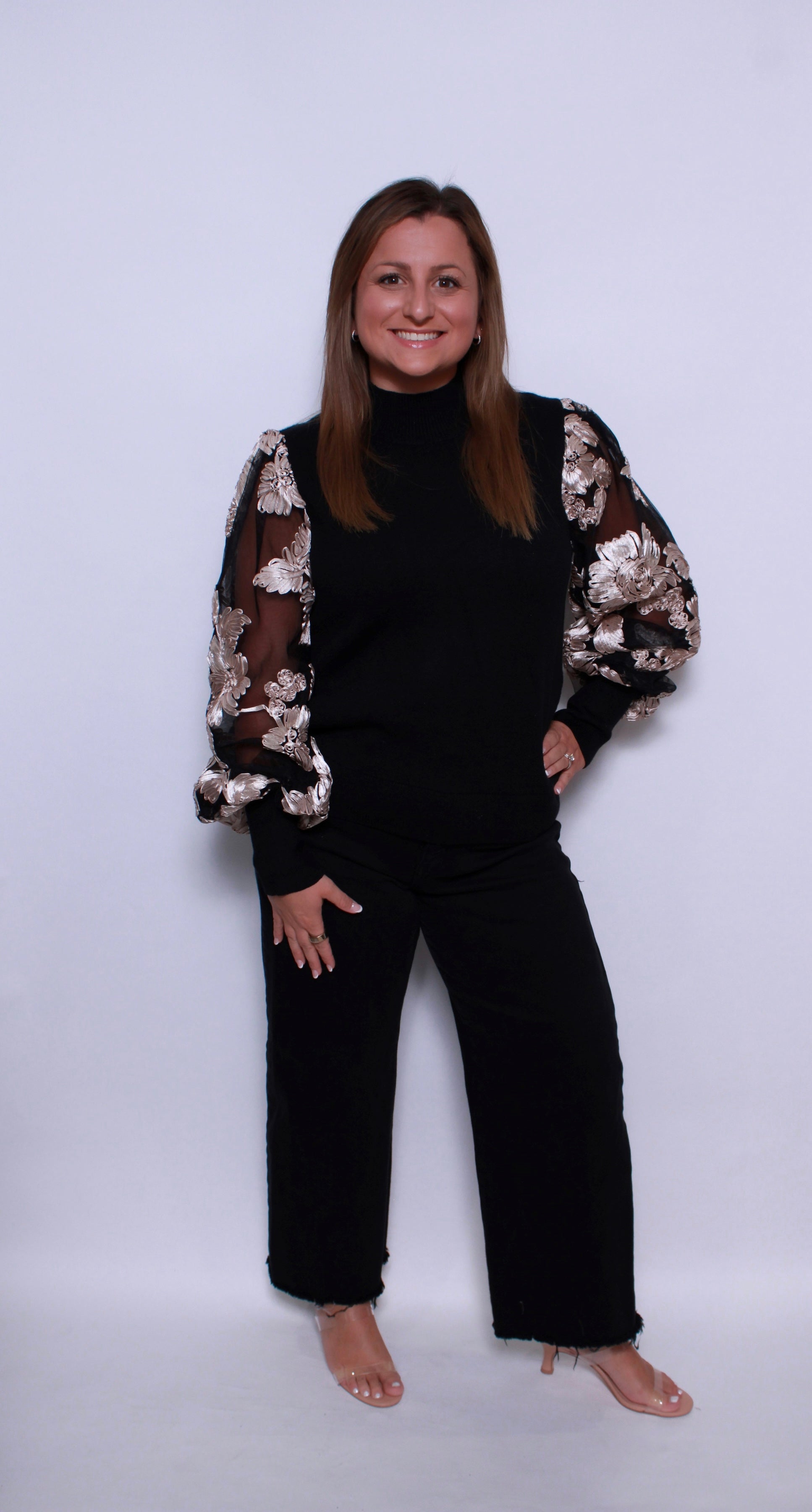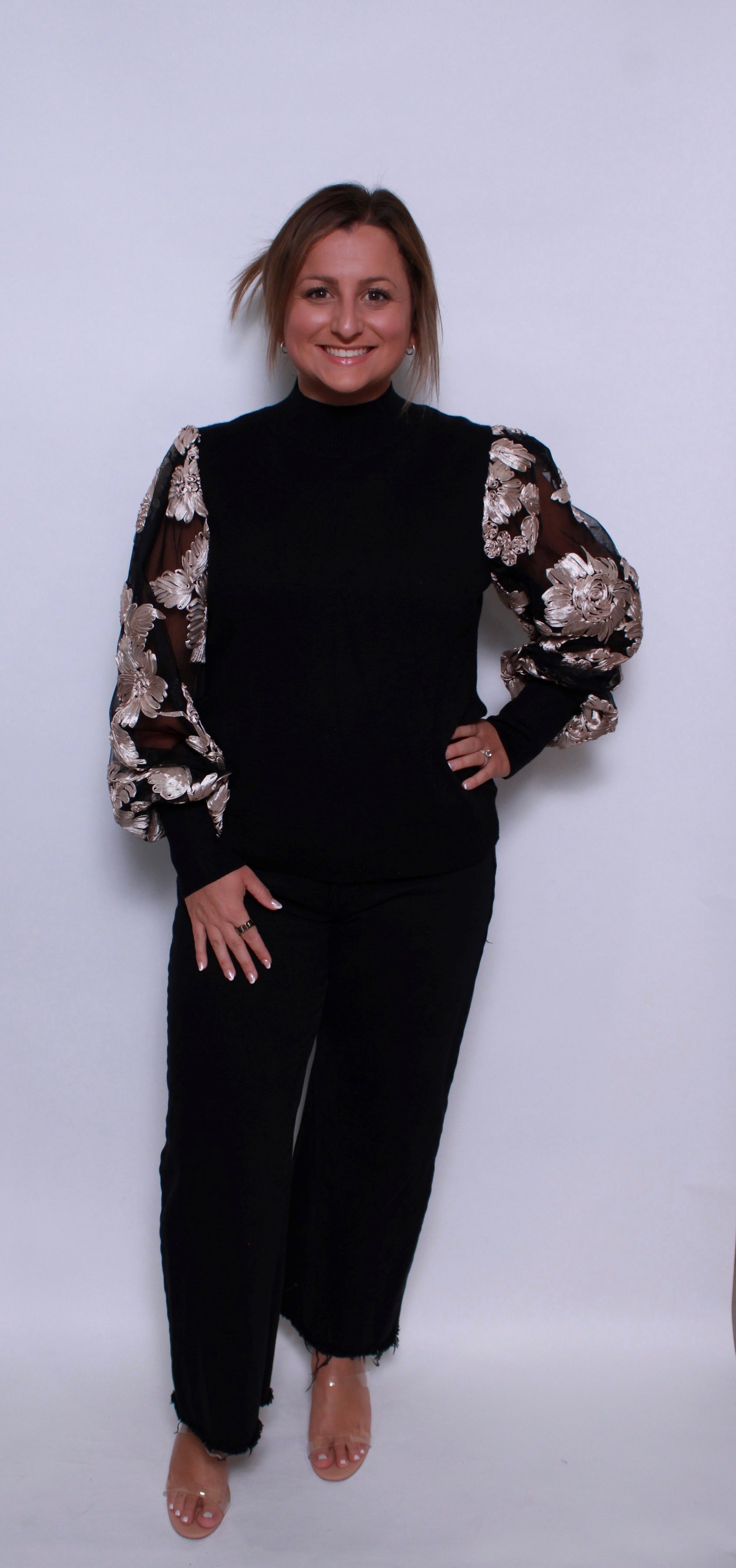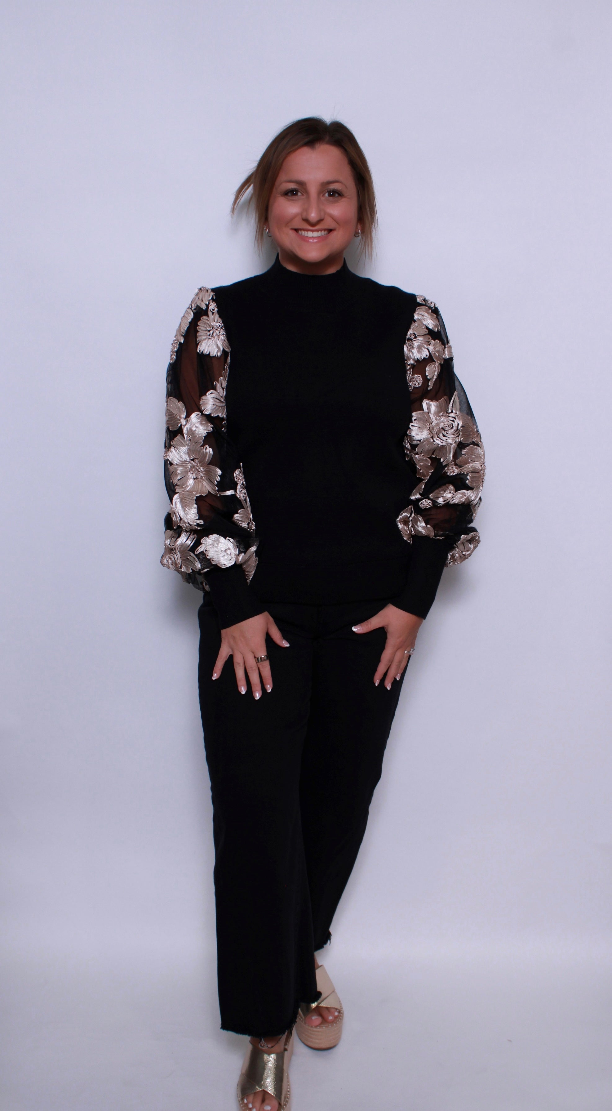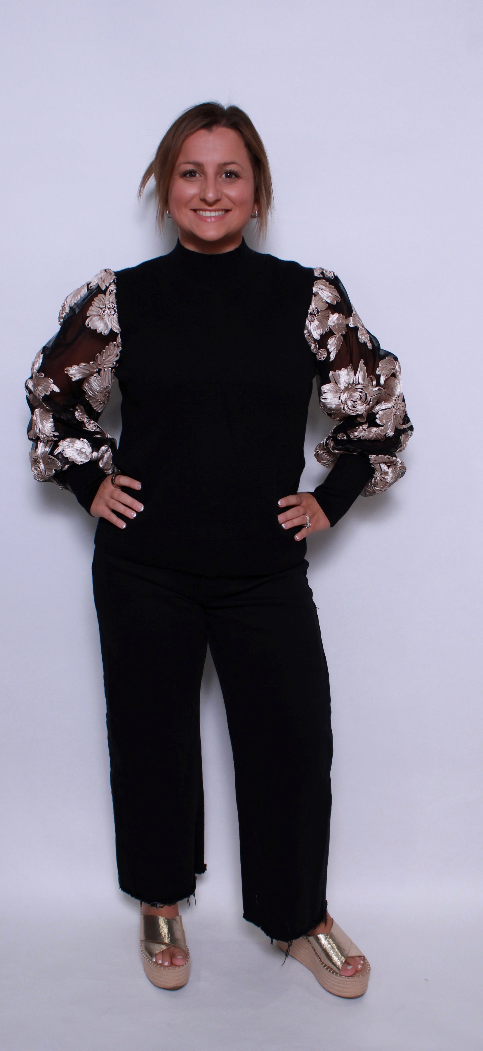 Ribbed knit top with mock neck, floral mesh puff sleeves, ribbing at the sleeve ends and hemline.