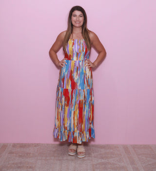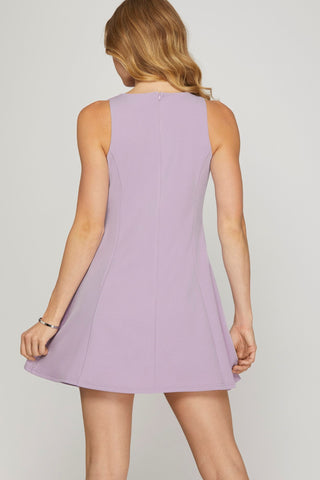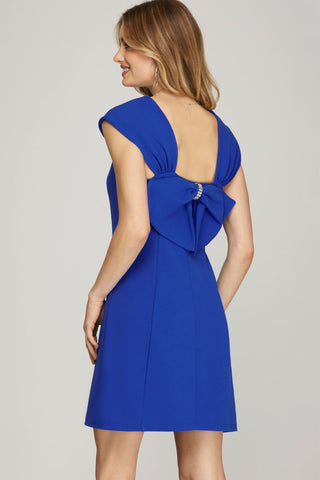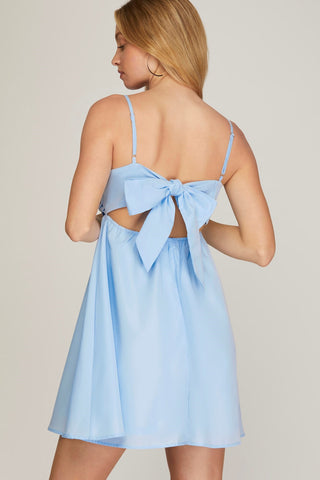 PLEATED CUT OUT BACK WOVEN DRESS WITH BACK TIE DETAIL