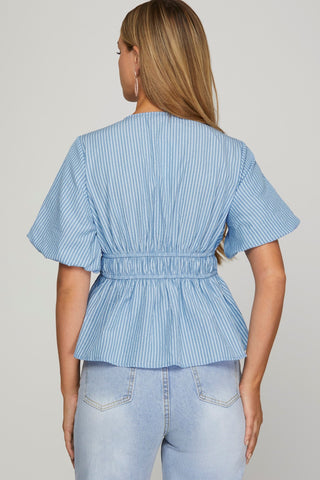 PUFF SHORT SLEEVE WOVEN STRIPED TOP WITH TIES