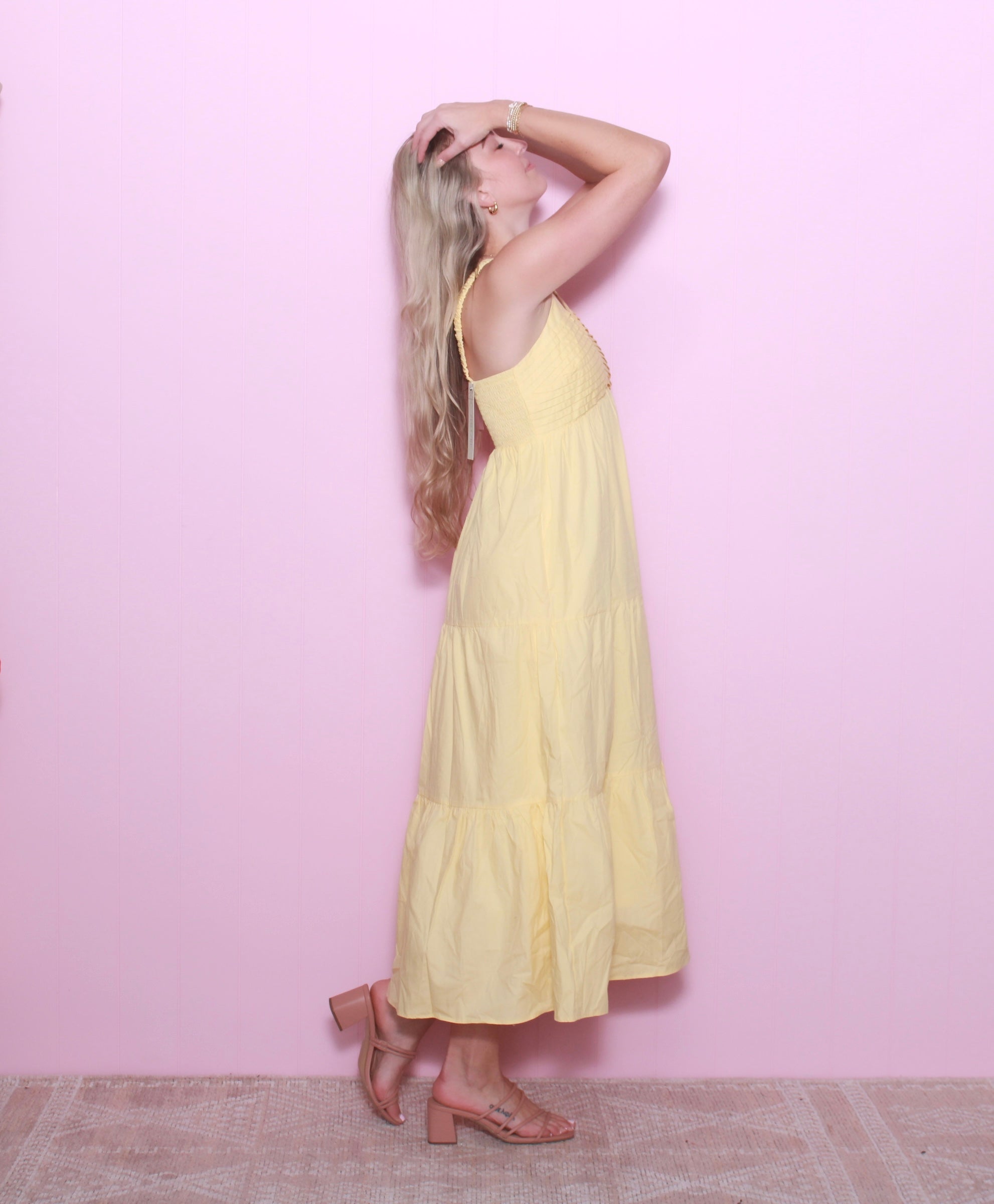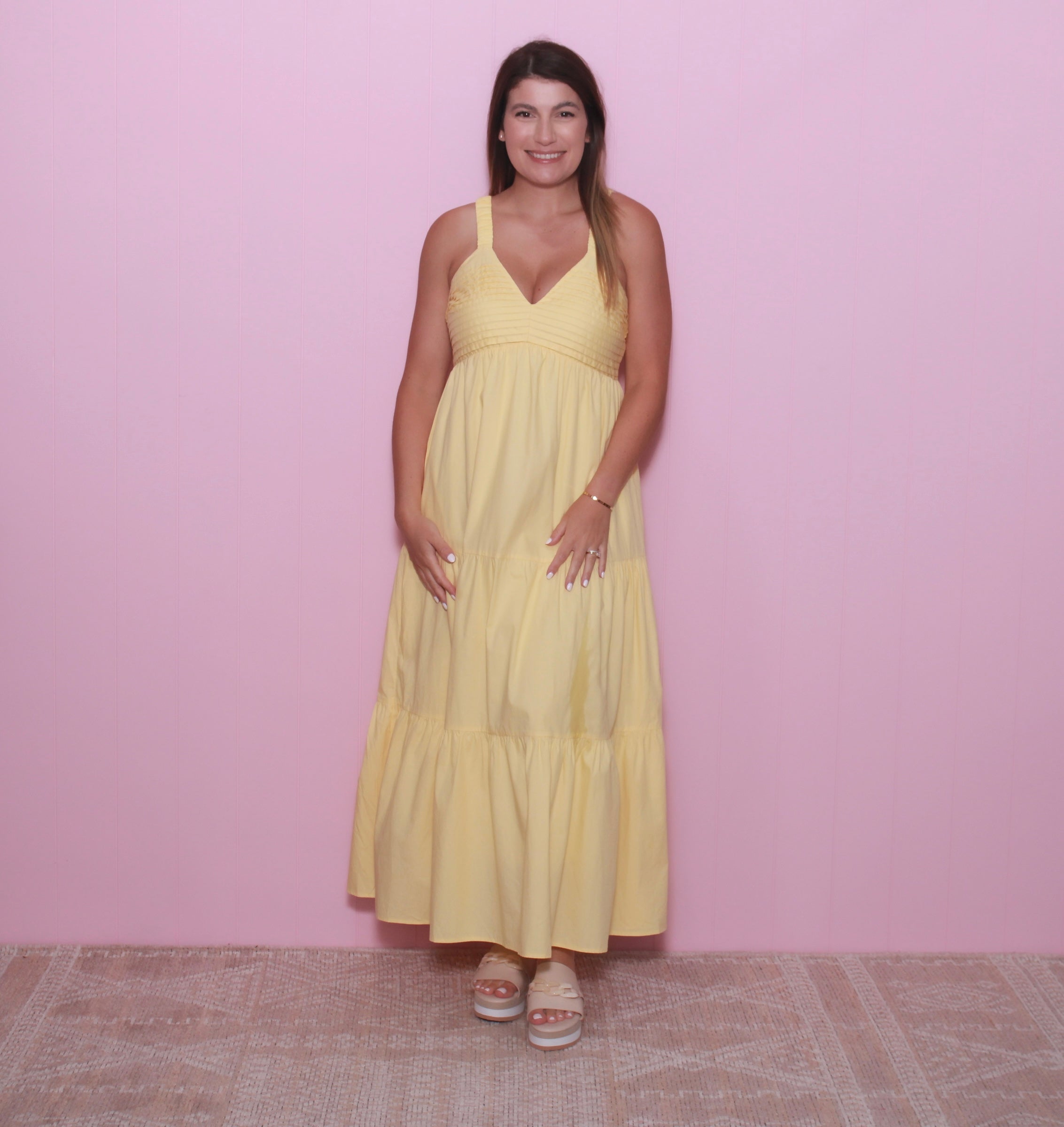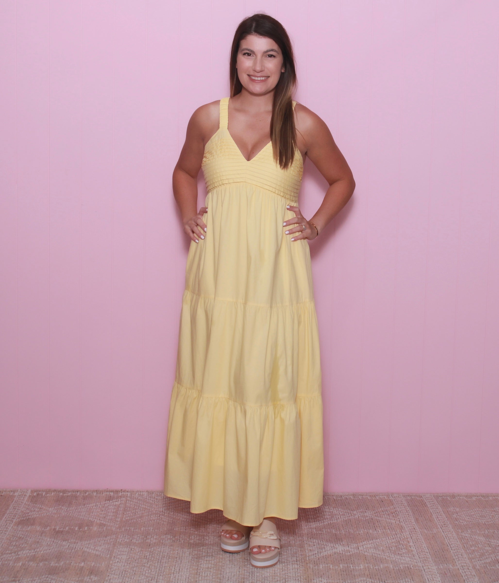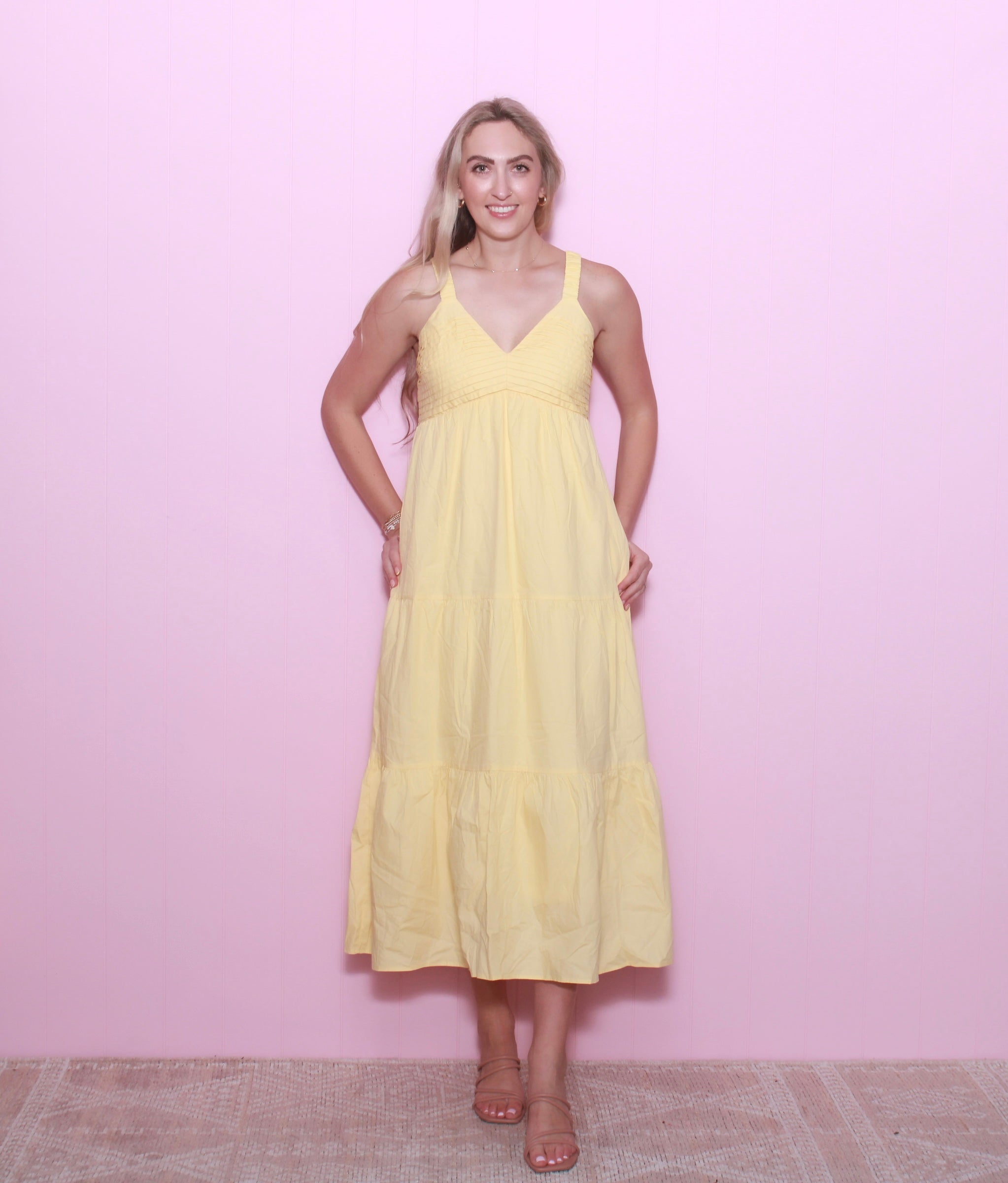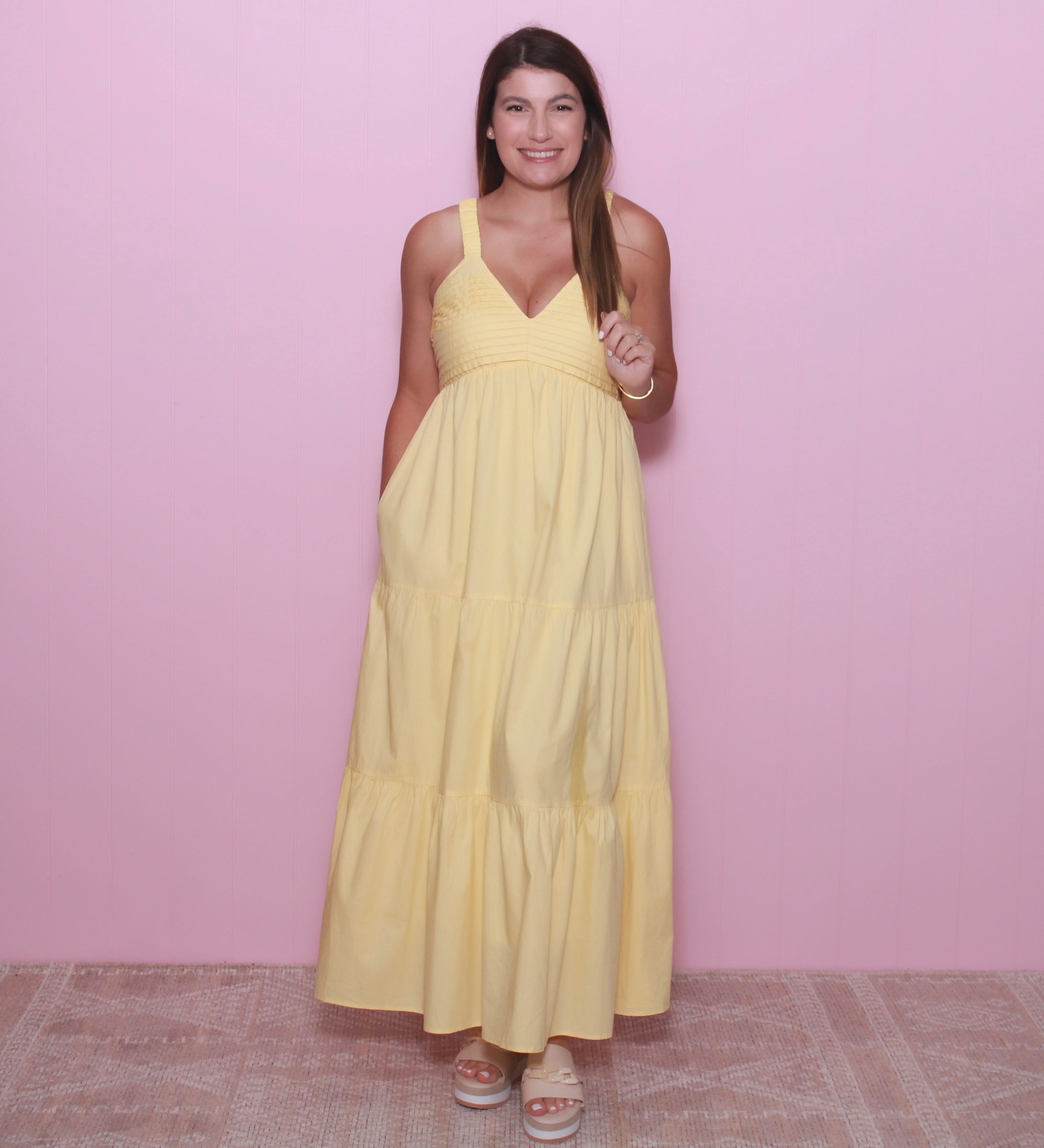 This sleeveless maxi dress combines the comfort of cotton and the elegance of poplin, with a V-neck and tiered design that flatters any figure. Delicate pintuck details and pockets add practicality and style. Must-have for effortless summer chic!