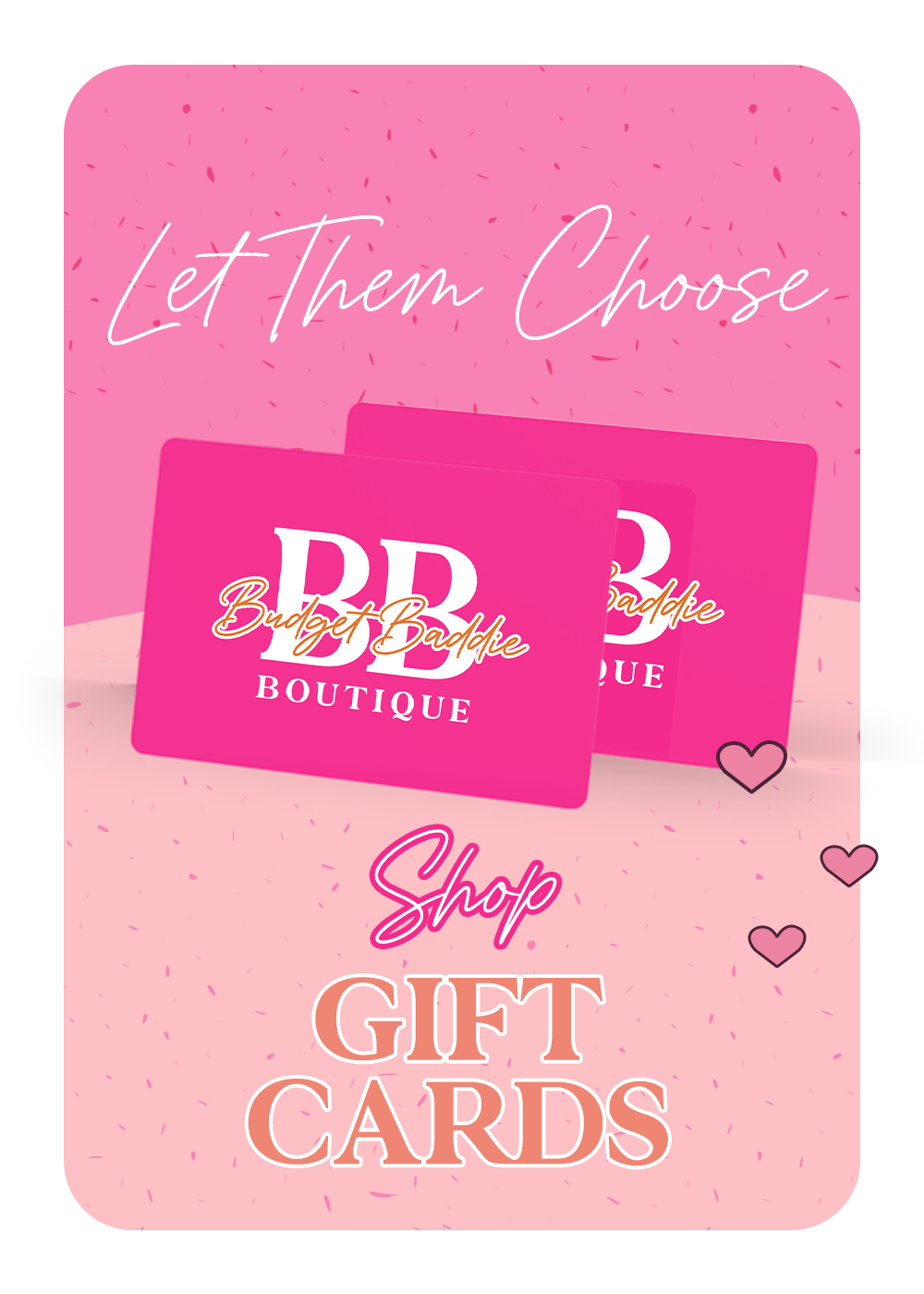 Give the gift of style with the Budget Baddie Boutique Digital Gift Card! Perfect for trendsetters who love to mix, match, and slay on a budget. Easily redeemable online, it’s the ultimate way to treat someone special to all their favorite looks—no stress, just sass!